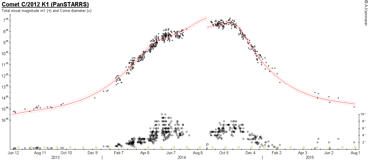 pre-perihelion: m = 5.1 mag + 5×log D + 9.4×log r post-perihelion: m = 6.0 mag + 5×log D + 8.6×log rDue to the fact that the comet was unobservable between the opening of July and the end of August the observed maximum brightness was magnitude 7.2 around Oct. 20, 2014.