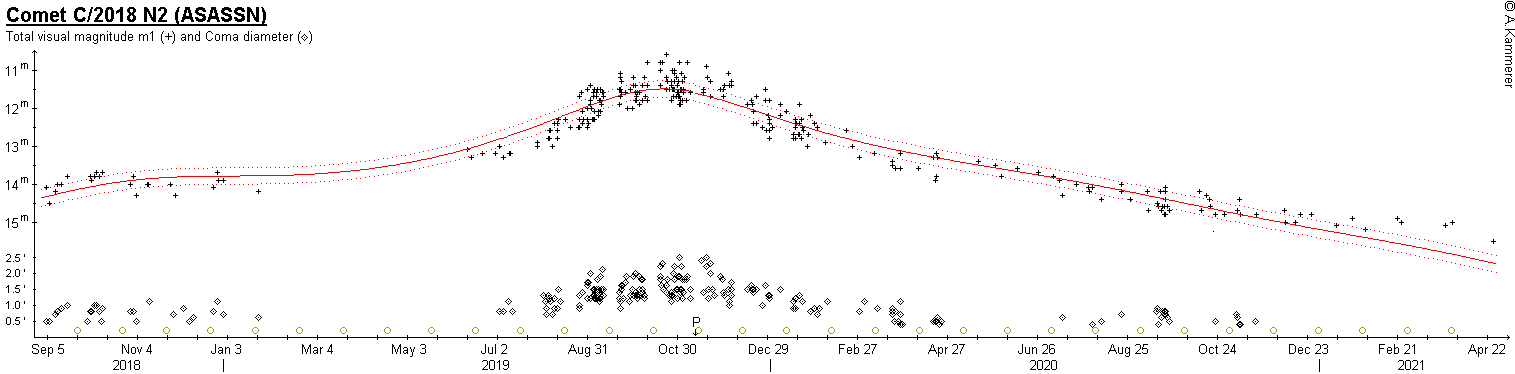 On July 7, 2018 the ASASSN team discovered a comet of magnitude 16 in the central part of Eridanus. Follow-up observations of comet C/2018 N2 (ASASSN) showed a strongly condensed 25" coma and a 15" tail in p.a. 220°. The comet will pass perihelion on Nov. 10, 2019 at a distance of 3.12 AU, expected to reach magnitude 11 (CBET 4534). It should be brighter than 16 mag until spring 2021, brighter than 13.5 mag between mid-2019 and mid-2020. During the latter time span it moves from Aries into Cepheus. Thus it will be well placed for mid-European observers during the most interesting weeks. Assuming an average activity parameter (n=4) the absolute brightness is magnitude 4.0, hinting towards a large object, which, alas, will not come close to the Sun.