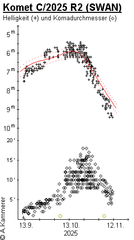 Am 10. September 2025 entdeckte Vladimir Bezugly (Ukraine) ein Objekt in den öffentlich zugänglichen SWAN-Aufnahmen, welches nach seinen Erfahrungen ein Komet sein könnte. Er informierte die Kometengemeinde, und schließlich gelang M. Masek am 12. September eine Aufnahme des Kometen mit einem 135mm-Teleobjektiv vom Cerro Paranal aus. Der im Sternbild Jungfrau positionierte Komet präsentierte sich als 7.5m helles Ob-jekt mit einer knapp 4' großen Koma und einem 2.8° langen Schweif in PW=114°. In den folgenden Tagen bestätigten weitere Beobachter diese Werte. Komet C/2025 R2 (SWAN) passierte das Perihel seiner Bahn in einer Sonnendistanz von 0.50 AE am 12. September. Der Komet nähert sich der Erde bis auf 0.26 AE (19. Oktober), wobei er eine Maximalhelligkeit von 6.0m erreichen könnte (CBET 5606). Im Falle einer durchschnittlichen Entwicklung dürfte der Komet bis Ende März 2026 heller als 16.0m sein. In diesem Zeitraum bewegt er sich durch die Sternbilder Waage, Skorpion, Schlangenträger, Schlange, Schild (Erdnähe), Adler, Wassermann, Fische und Widder. Von mitteleuropäischen Standorten aus wird er um den 10. Oktober über dem südwestlichen Abendhorizont auftauchen und bis in die erste Novemberwoche rasch an Horizonthöhe gewinnen. Mitte Januar weist er die größte Horizonthöhe (etwa 50°) auf, um danach kontinuierlich wieder dem Horizont entgegenzustreben. Der Komet hat eine Umlaufszeit von etwa 680 Jahren (CBET 5618).