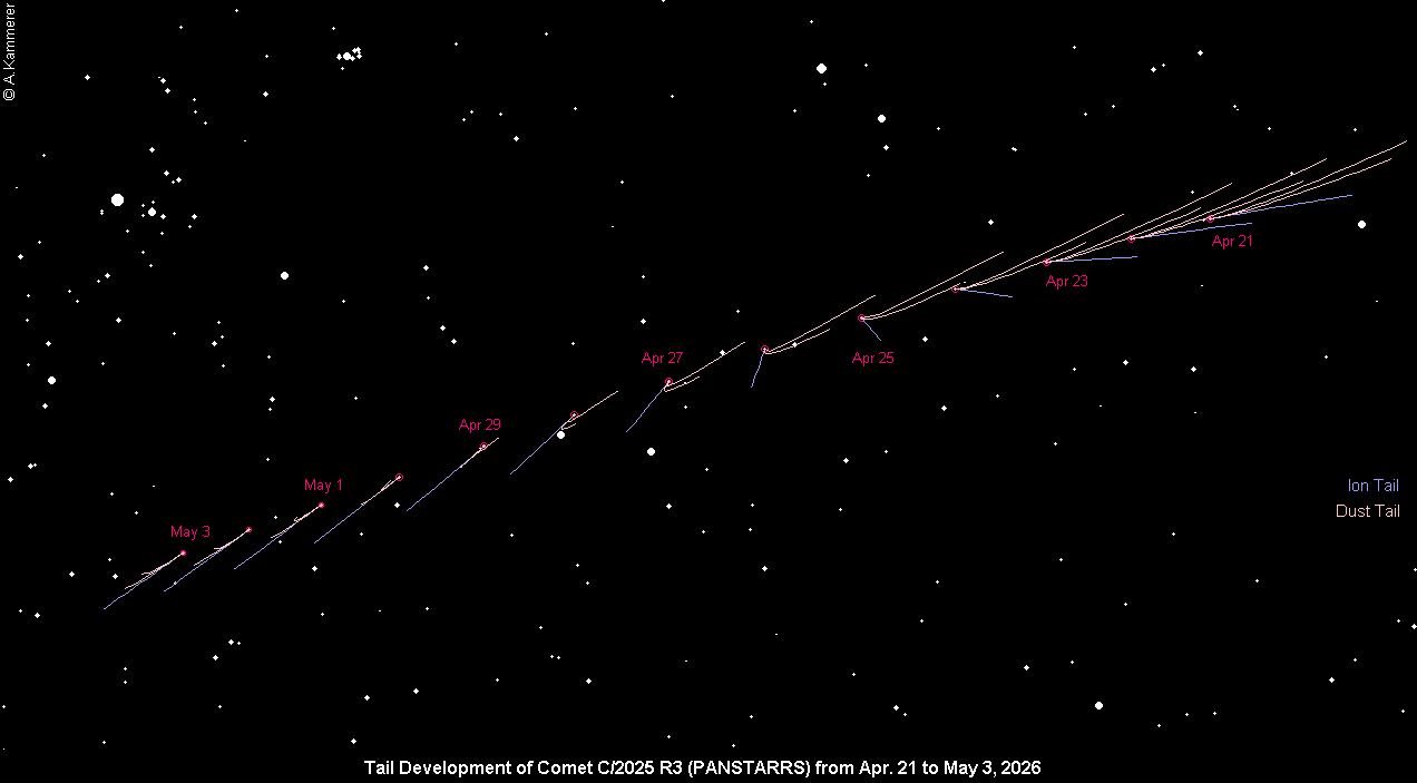 Ende März 2026 erreichte die deutlich verdichtete (DC 6) Koma einen Durchmesser von knapp 6' (400.000 km).Sollte der Komet sein Perihel erreichen, wird er einige Tage lang eine interessante Schweifmorphologie aufweisen, die in der nachfolgenden Grafik dargestellt ist.
