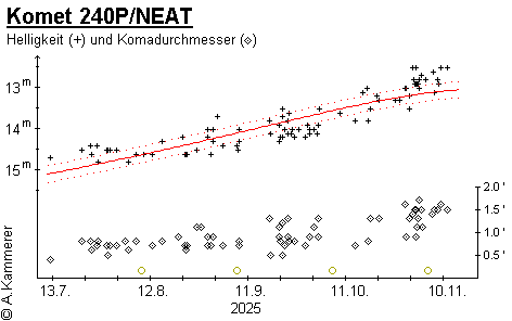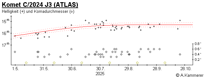 m0 = 8.6m / n = 3. Ende Dezember 2024 war die Helligkeit auf 14.0m, Mitte Oktober 2025 auf 16.0m zurückgegangen.Scheinbare Helligkeit und Komadurchmesser
