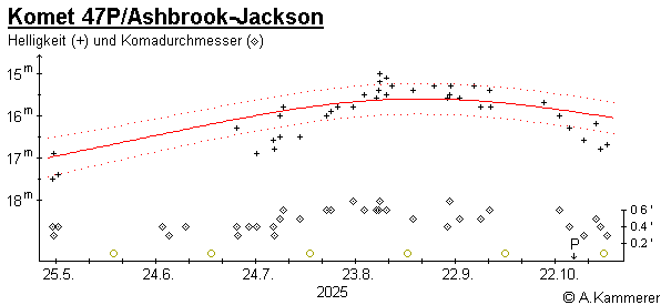 Der Komet 47P/Ashbrook-Jackson (P=8.36a) wird am 27. Oktober 2025 sein Perihel in der Sonnendistanz von 2.81 AE passieren, dürfte aber bereits im September seine Maximalhelligkeit von 14.5m erreichen. Für mitteleuropäische Standorte taucht der Komet Anfang Juli am Morgenhimmel auf.
