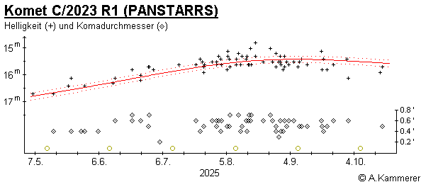 m0 = 8.2m / n = 3. Damit wurde der Komet im September 2025 15.4m hell und sollte Mitte Juni 2026 eine Maximalhelligkeit von etwa 14.5m erreichen. Der Durchmesser der merklich verdichteten (DC 5) Koma liegt aktuell recht konstant bei 0.6' (90.000 km). Ein kurzer, in östliche Richtung weisender Schweifansatz kann auf CCD-Aufnahmen nachgewiesen werden.Scheinbare Helligkeit und Komadurchmesser