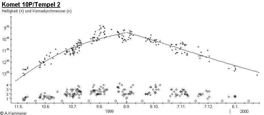 Der FGK-Projektkomet 1999, 10P/Tempel 2, blieb leider erkennbar hinter den Erwartungen zurück, so daß er aufgrund seiner südlichen Deklinationen schwer beobachtbar war, was sich auch in den lediglich 28 bis Anfang Februar 2000 zugesandten Beobachtungen von 6 FG-Beobachtern widerspiegelt. Die Hinzunahme von 215 internationalen Beobachtungen gestattet aber recht sichere Aussagen. Der Komet blieb insgesamt ein schwieriges Objekt, da sich seine Koma parallel zur Helligkeitszunahme ausdehnte, so daß die Flächenhelligkeit stets sehr gering blieb. Lediglich die zentrale Kondensation konnte in einem 30cm-Teleskop recht gut gesehen werden. Aus diesem Grund wurde für die Bestimmung der Helligkeitsparameter auch eine Aperturkorrektur an die Schätzungen angebracht.