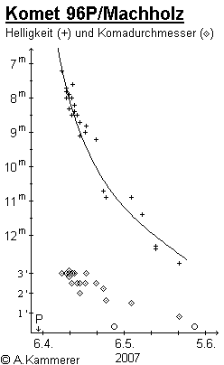 Der bahndynamisch hochinteressante aber sehr schwierig beobachtbare Komet 96P/Machholz wird Anfang April 2007 erneut durch sein Perihel laufen. In jenen Tagen bis zu 2m hell, steht er der Sonne zu nahe und kann nur mittels der SOHO-Sonde beobachtet werden. Erste Chancen für erdgebundene Sichtungen werden sich um den 15. April ergeben, wenn der Komet als etwa 7m helles Objekt tief über dem morgendlichen Nordosthorizont im Sternbild Fische auftauchen wird. In den folgenden Wochen klettert er aufgrund seiner westwärts gerichteten Bewegung (in Richtung des Sternbilds Schlangenträger) zwar rasch höher, doch nimmt seine Helligkeit rapide ab. Schon eine Sichtung kann daher als Erfolg gewertet werden, genaue Beobachtungen wären für eine bessere Bestimmung der Helligkeitsparameter nützlich.