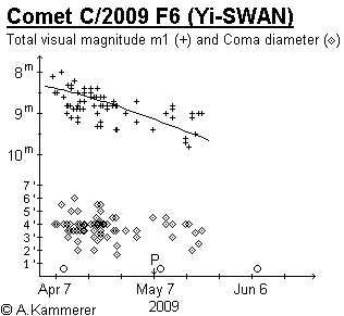 On Apr. 4, 2009 R.D. Matson reported the discovery of a comet in data aquired by the satellite SWAN. By Apr. 6 one visual observer and several using CCD equipment confirmed the comet. Hereupon H. Yamaoka, of Kyushu University, reported to have received an email from the Korean Dae-am Yi, in which he informed him about the discovery of a 12 mag comet on two CCD images taken on Mar. 26 in the constellation of Lacerta. On one image taken with a digital camera on Mar. 25 the comet could be identified as a 10.7 mag object. Visual observations of comet C/2009 F6 (Yi-SWAN) from Apr. 6 showed it as a 8.5 mag object with a condensed coma of diameter 4' (IAUC 9034/35).