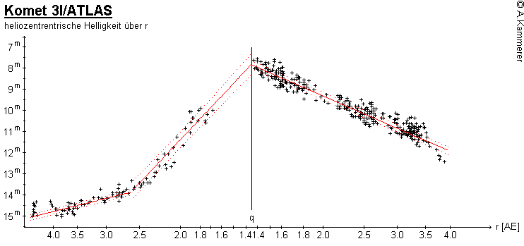 Die entsprechenden Helligkeitsparameter lauten: t < -60d: m0 = 11.8m / n = 2Anfang Juli 2025 erst 17.5m hell stieg die Helligkeit bis zum 30. August lediglich auf 16.0m an. Dann aber kam es zu einer raschen Helligkeitszunahme, so dass der Komet beim Verschwinden in der Abenddämmerung Anfang Oktober bereits 12.0m hell war. Die Maximalhelligkeit von 9.5m wurde schließlich in den ersten Novembertagen 2025 erreicht. Anfang Februar 2026 wies der Komet noch eine Helligkeit von 14.0m auf. Mitte März dürfte der Komet schwächer als 16.0m werden.