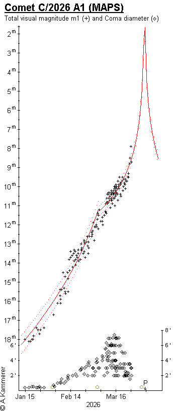 Based on 173 observations from 25 observers (until Mar. 25, 2026), the following brightness parameters result: t < -30d: m0 = 10.0 mag / n = 9.3This means that the comet could briefly become brighter than 0 mag on April 4. However, there is still the possibility that the comet will disintegrate on its way toward the Sun. Conversely, it must be clearly stated that we know very little about the brightness development of larger Kreutz comets, and surprises may therefore occur. The latest observations seem to indicate a certain recovery.