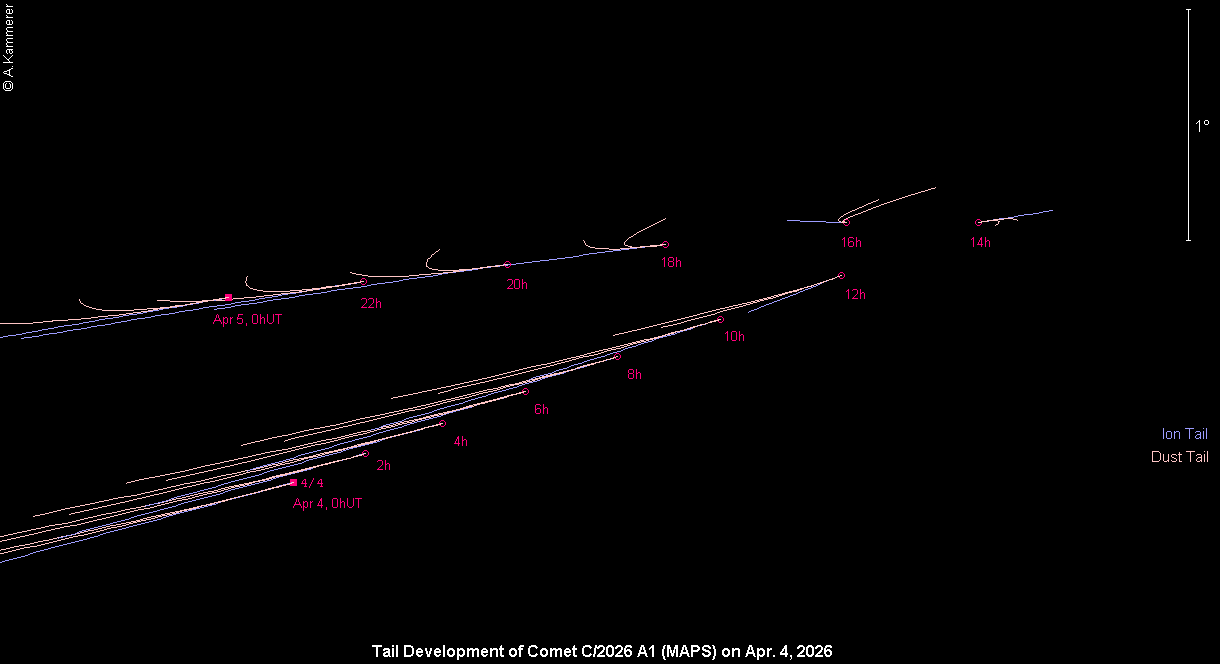 A member of the Kreutz group was discovered as the first comet of 2026 on Jan. 13 in the constellation Columba as part of the MAPS project. A total magnitude of 18.0 was determined via the images of comet C/2026 A1 (MAPS), with a diffuse coma of 12" diameter. Remote images taken by Michael Jäger and Gerald Rhemann on Jan. 18 showed a 2.5' coma of total brightness 16.1 mag. Subsequently, the comet could be tracked back to Dec. 18, 2025. This is the Kreutz comet that has been observed at the greatest solar distance to date. The comet will pass perihelion on Apr. 4, 2026 at a solar distance of only 0.0057 AU (CBET 5658). Assuming an average brightness development it could become as bright as –2 mag during a very short time, but it will then be positioned very close to the Sun. Thus it is more likely that only solar probes will be able to track its development during the days around perihelion.