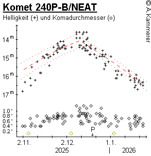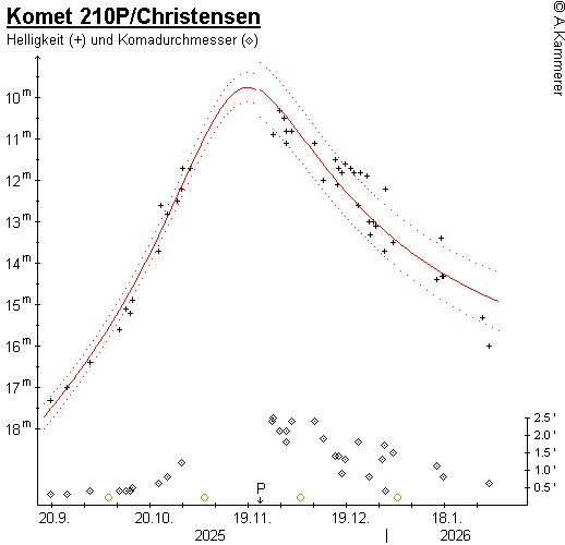 m0 = 8.6m / n = 3. Ende Dezember 2024 war die Helligkeit auf 14.0m, Mitte Oktober 2025 auf 16.0m zurückgegangen.Scheinbare Helligkeit und Komadurchmesser