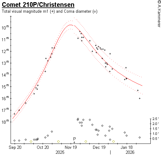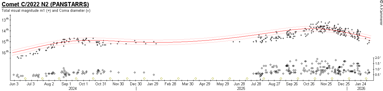 m0=0.3 mag / n=6. Thus the comet peaked at 14.8 mag in mid-January 2026. The coma diameter increased only from 0.6' (130,000 km) in 2024/25 to 0.7' (150,000 km) in 2025/26, with the coma medium-condensed (DC 5). CCD observers document a short tail since the turn of 2024/25, which reached a length of 5' (about 8 Mio. km) at the opening of 2026.Total Brightness and Coma Diameter