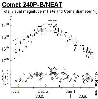 On Oct. 3, 2025 images taken with the 2.25 m Bok reflector at Kitt Peak showed a fragment (B) located 74" west and 53" south of the main component (A). This fragment could be traced back to June 2025. While the main component had a brightness of 13.5 mag, a coma diameter of 1.1', and an 8.7' long tail towards p.a. 259°, fragment B had a brightness of 18.5 mag and a 0.2' long tail towards p.a. 273° (CBET 5622). Fragment B slowly drifted away from the main component and became brighter over several weeks. It reached maximum brightness of 13.8 mag around Dec. 10, 2025. According to 127 observations by 23 observers the fragment showed the following brightness development:Total Brightness and Coma Diameter of Fragment B
